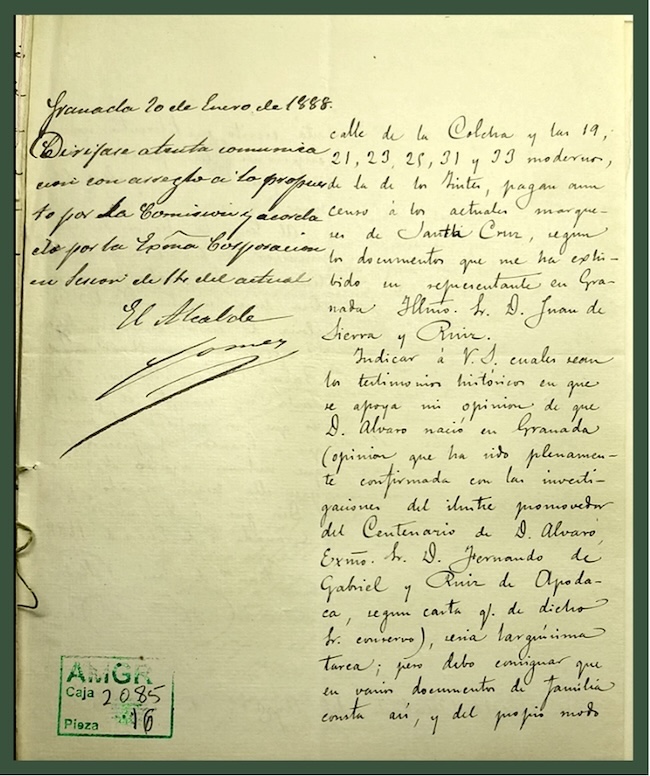Por eso dirigió cartas a la Facultad de Filosofía y Letras, a la Comisión de Monumentos, al Liceo y al Centro Artístico; en ellas les solicitaba información fehaciente sobre el granadinismo del almirante: “ha surgido un incidente que, aunque terminado, deja huellas de duda entre los eruditos, que a los granadinos nos corresponde estinguir (sic) para mayor enaltecimiento de nuestra hermosa historia. Refiérome al hecho de haberse discutido ha poco si el primer marqués de Santa Cruz nació en Granada o si fue Guadix la población en que abrió los ojos a la luz…”. Rogaba a los historiadores que buscasen su partida de nacimiento por las parroquias de Granada. A renglón seguido, nombró al catedrático y político Juan Facundo Riaño para que representara a Granada en la comisión madrileña. Y, si resultaban ciertas las averiguaciones que pedía en su carta, entonces sería colocada una lápida.