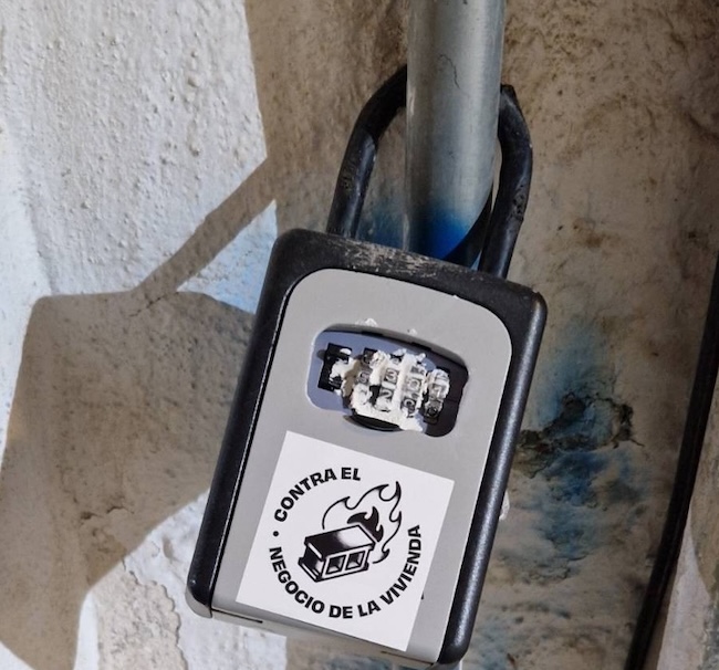 Durante la mañana de hoy han aparecido saboteados aproximadamente 500 cajetines de acceso a viviendas de uso turístico repartidos por distintos barrios de la ciudad. Los dispositivos, instalados en portales y fachadas para facilitar la entrada autónoma de visitantes, han sido inutilizados mediante distintos métodos, impidiendo el acceso a los inmuebles. Los cajetines saboteados han sido adornados con pegatinas que incluyen el mensaje “Contra el negocio de la vivienda”, informa el sindicato.