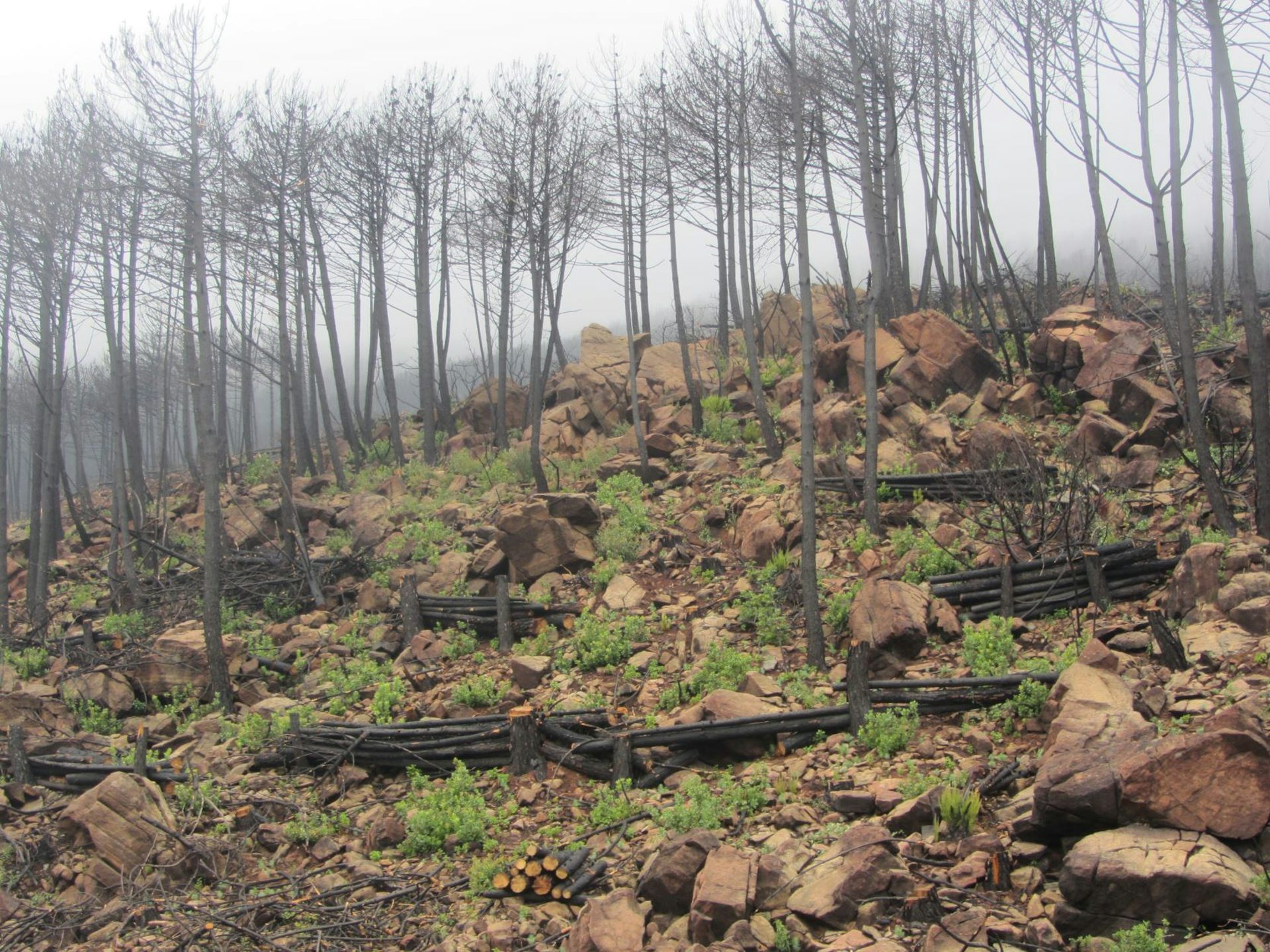 Las copas de los árboles quemados disminuyen el impacto de las gotas de lluvia en el suelo y, por lo tanto, disminuyen el potencial de erosión posincendio.