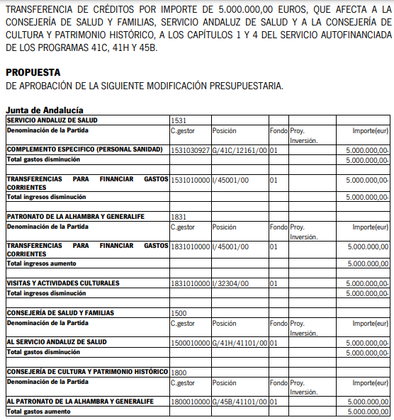 Pero el desaguisado siguió. Los 5 millones requeridos por la Alhambra para impedir la quiebra, como se refleja en el expediente, salió de la partida para el complemento específico del personal de sanidad.